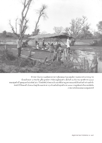 นั่งบนเรือชะล่า ๒ ลำาต่อกัน ปูพื้น มุงหลังคา กำาลังถ่ออยู่ในทุ่งสร้าง เมื่อวันที่ ๒๖ ธันวาคม พุทธศักราช ๒๔๔๙